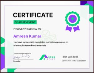 - Certificate of Achievement (Training Program – Microsoft Azure Fundamentals), Issued by Star Agile, Certification code: SASM210101, Jan 2025