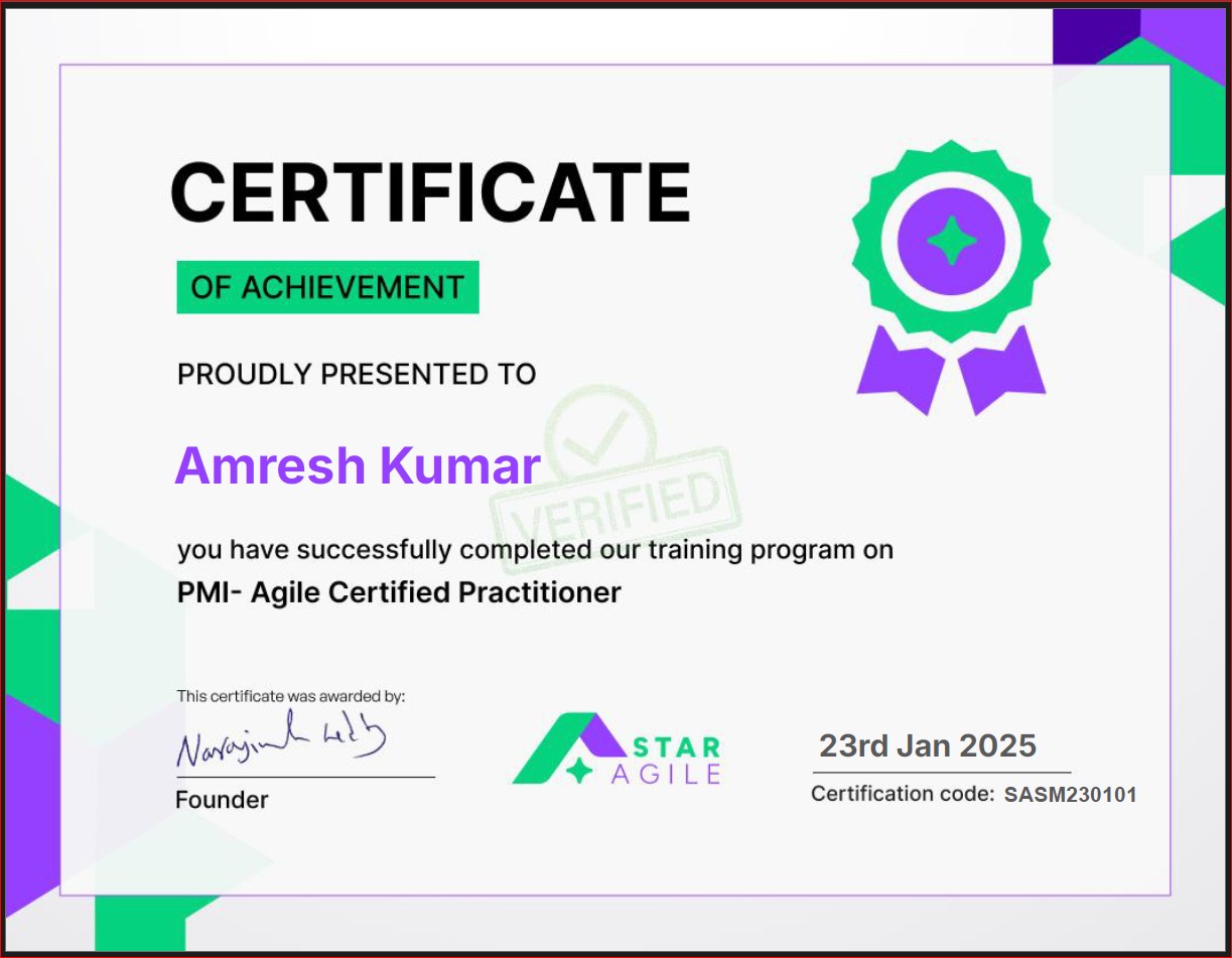 - Certificate of Achievement (Training Program – PMI Agile Certified Practitioner), Issued by Star Agile, Certification code: SASM230101, Jan 2025