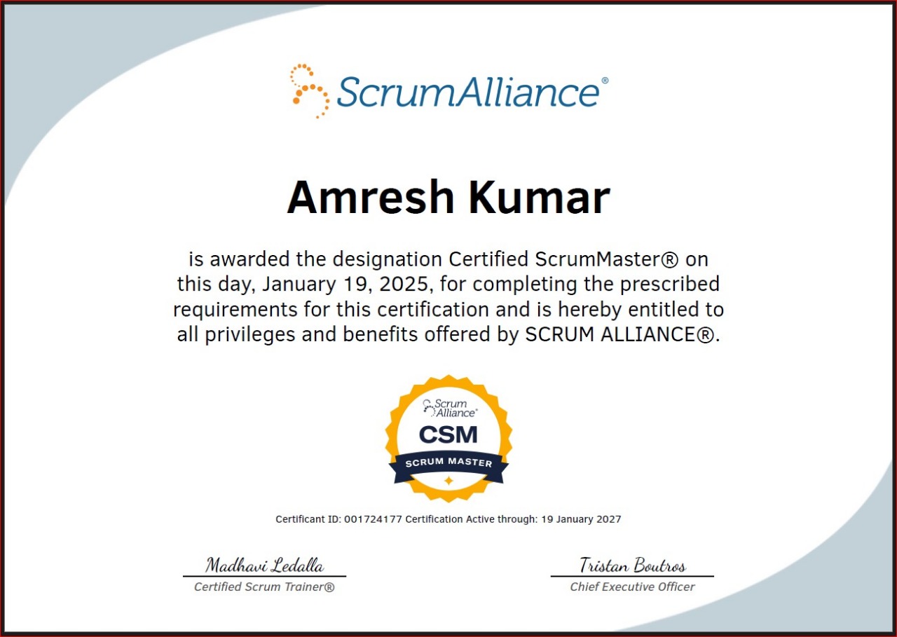 - Certified ScrumMaster®, Issued by Scrum Alliance, Badge ID: 2040832, Jan 2025 to Jan 2027 (https://bcert.me/sfnzqxmmj)