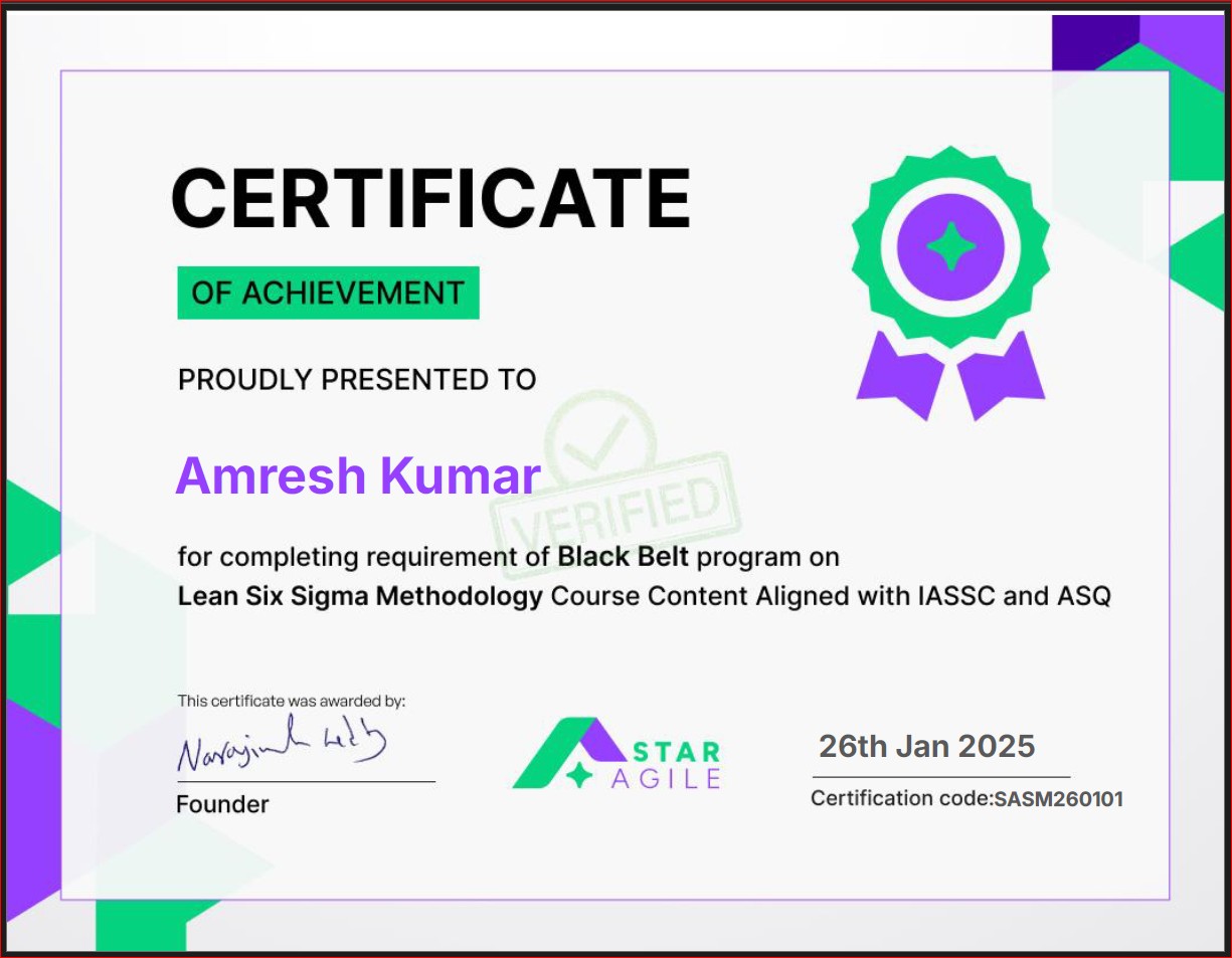 - Certificate of Achievement (Lean Six Sigma Methodology – Black Belt), Issued by Star Agile, Certification code: SASM260101, Jan 2025