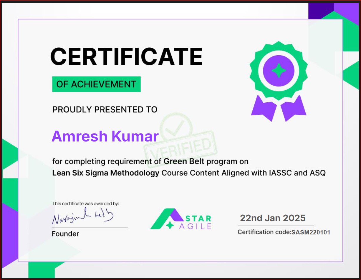 - Certificate of Achievement (Lean Six Sigma Methodology – Green Belt), Issued by Star Agile, Certification code: SASM220101, Jan 2025